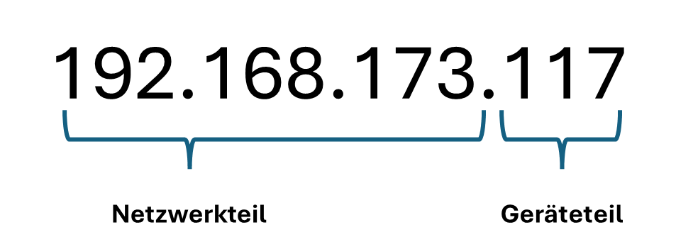Den in einem Teilnetz einheitlichen ersten Adressenabschnitt nennt man Netzwerkteil einer IP-Adresse. Der zweite Adressenabschnitt dient der Unterscheidung der einzelnen Rechner innerhalb eines Teilnetzes und heißt Geräteteil einer IP-Adresse.