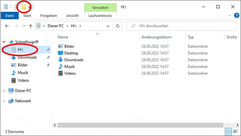- Öffne den Dateimanager (Ordner-Symbol mit deinem Namen, oben links auf deinem Desktop) und navigiere in der Schnellansicht zum Ordner H:/.